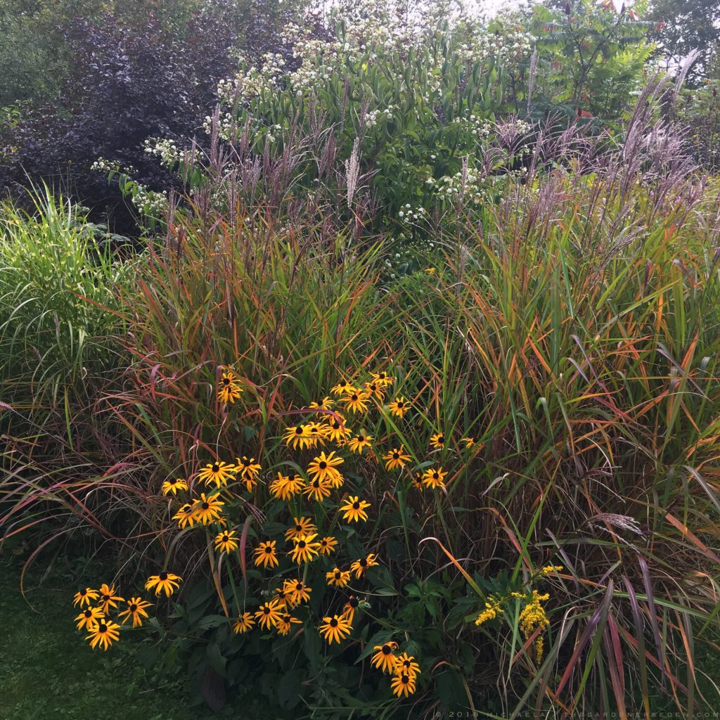 September’s Garden: Rudbeckia fulgida, Miscanthus purpurascens, Miscanthus sinensis, Physocarpus opulifolius ‘Diablo’, Hepacodium miconioides