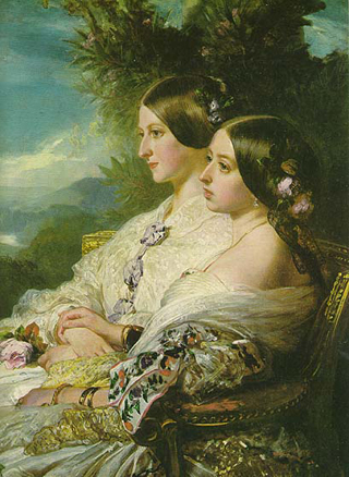 This is a portrait of Victorie, Duchesse de Nemours, with her friend, Queen Victoria in the foreground – Franz Xzver Winterhalter – 1852