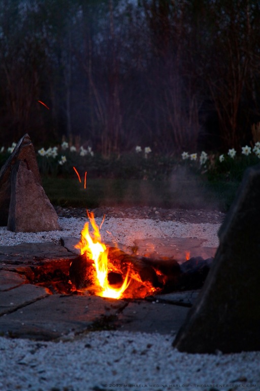Fire & Ice Follies Upon a May Night: Enjoying Narcicissus ‘Ice Follies’ & Dan Snow’s Fire Sculpture After a Day of Work in the Garden
