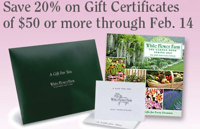 20% off White Flower Farm Gift Certificates Over $50 for Valentine’s Day! Use Code AS309. Offer valid 1/30/10 to 2/14/10