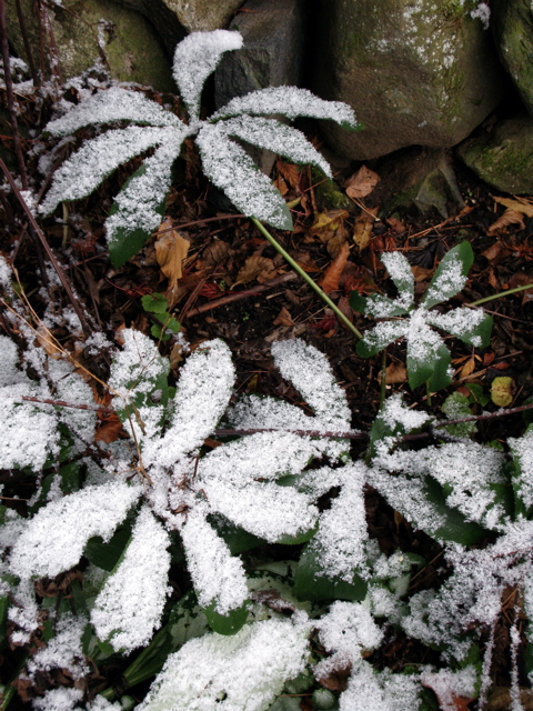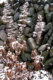 Rodgersia remnants strike a feminine pose beside the stone wall…