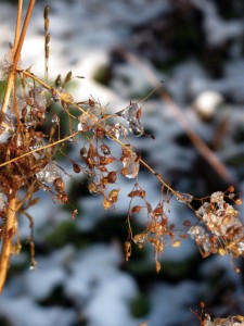 Heuchera seed-pods with ice droplets, sparkle and gleam in morning light