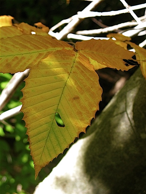 The first golden leaves. American Beech, (Fagus grandifolia).