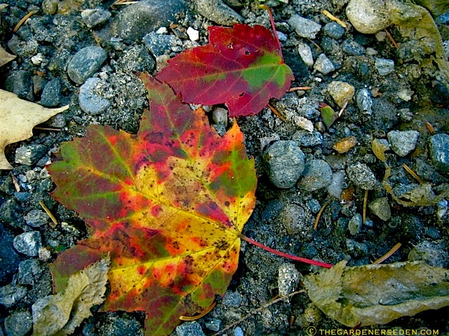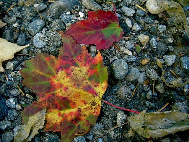 Leaves shed early by two nearby maple trees stand out against the gray stone in a washout…