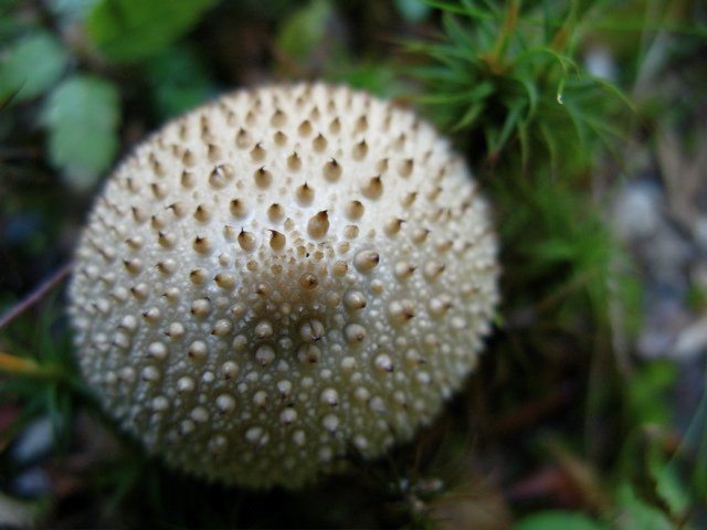 A common puffball mushroom, (Lycoperdon perlatum), brings to mind a sea urchin when viewed up close on the mossy forest floor.