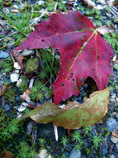 A red maple leaf, (Acer rubrum), settled into new moss along the edge of the woodland…