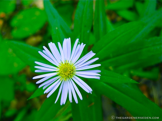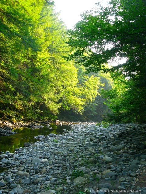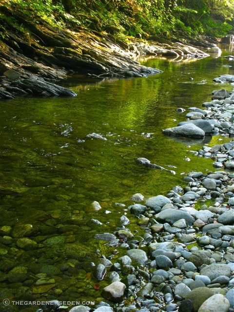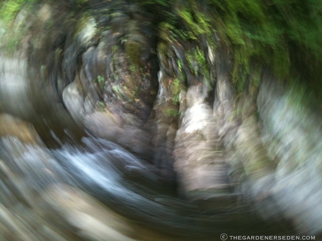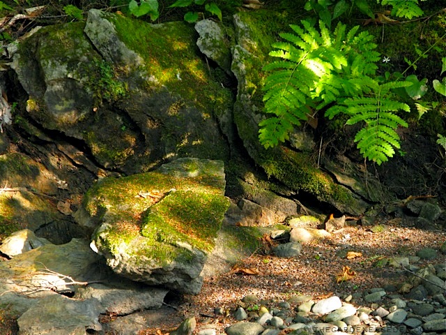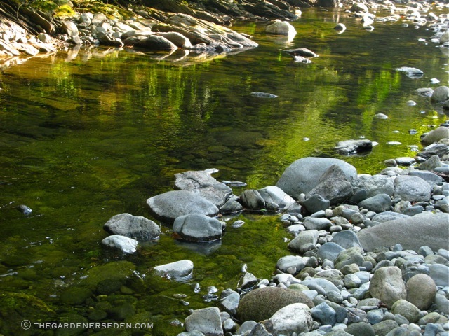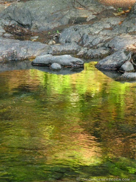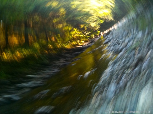 September… Still summer. Some days so hot and humid that the only relief is a trip to Green River. The water is low and the smooth rocks are hot beneath bare feet. I slip along the bank; verdant moss, flickering light and a blurred mosaic of algae-coated stones and silver fish. Still summer… But with hints of the coming season; crimson-tinted vines, gold-tipped ferns, and a surprise of blue asters amongst the greenery…