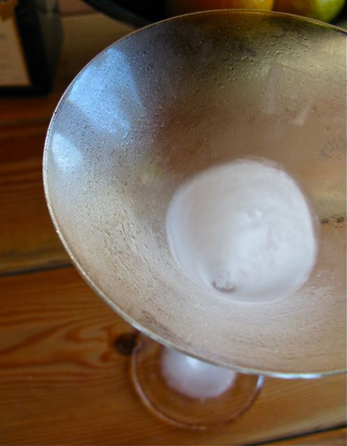Chill martini glasses in the freezer well ahead of time. Prepare ripe mangoes by peeling, pitting and placing wedges of the fruit in a food processor with a metal blade. Puree until smooth. Set aside.