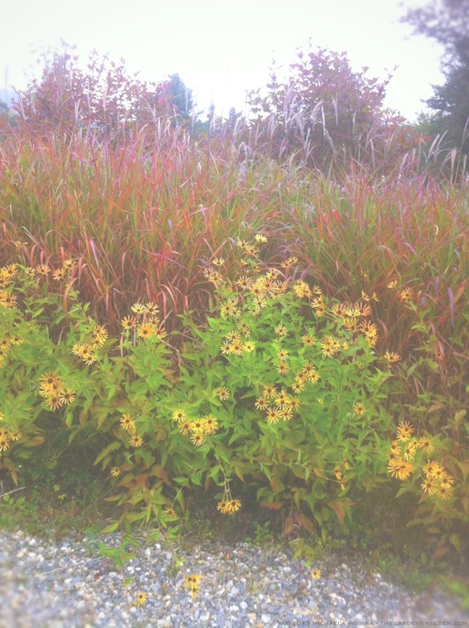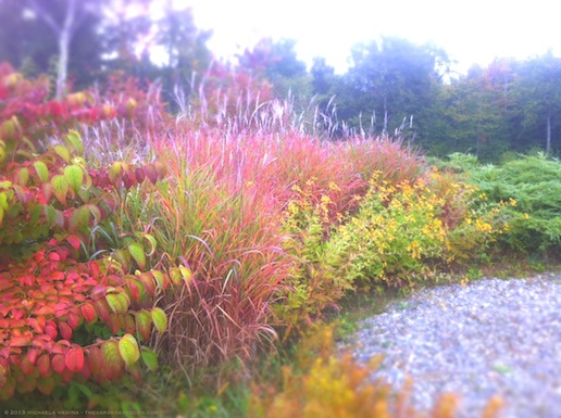 The Meadow Border Catches Fire to Burn Through the Equinox (Amsonia hubrichtii, Viburnum plicatum var. tomentosum), Miscanthus sinensis purpurascens, Rudbeckia subtomentosa, Juniperus pfitzeriana )