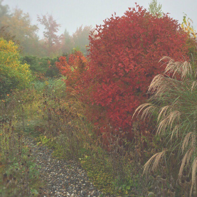 With fiery colors peeking through a misty, morning shroud, October began on a moody note today. The Cranberrybush (Viburnum trilobum ‘Bailey Compact’) has turned the brightest shade of red that I can ever remember and beyond, Fragrant Abelia (Abelia mosanensis) and Spicebush (Lindera benzoin), have caught fire in an orange and yellow blaze of glory.