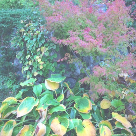 I love to play with changing, seasonal contrasts and harmonies in my garden designs. Here, Amsonia illustris, Itea virginica ‘Little Henry’ and Physocarpus opulifolius ‘Summer Wine’ light up the entry garden in gold, red and maroon.Â